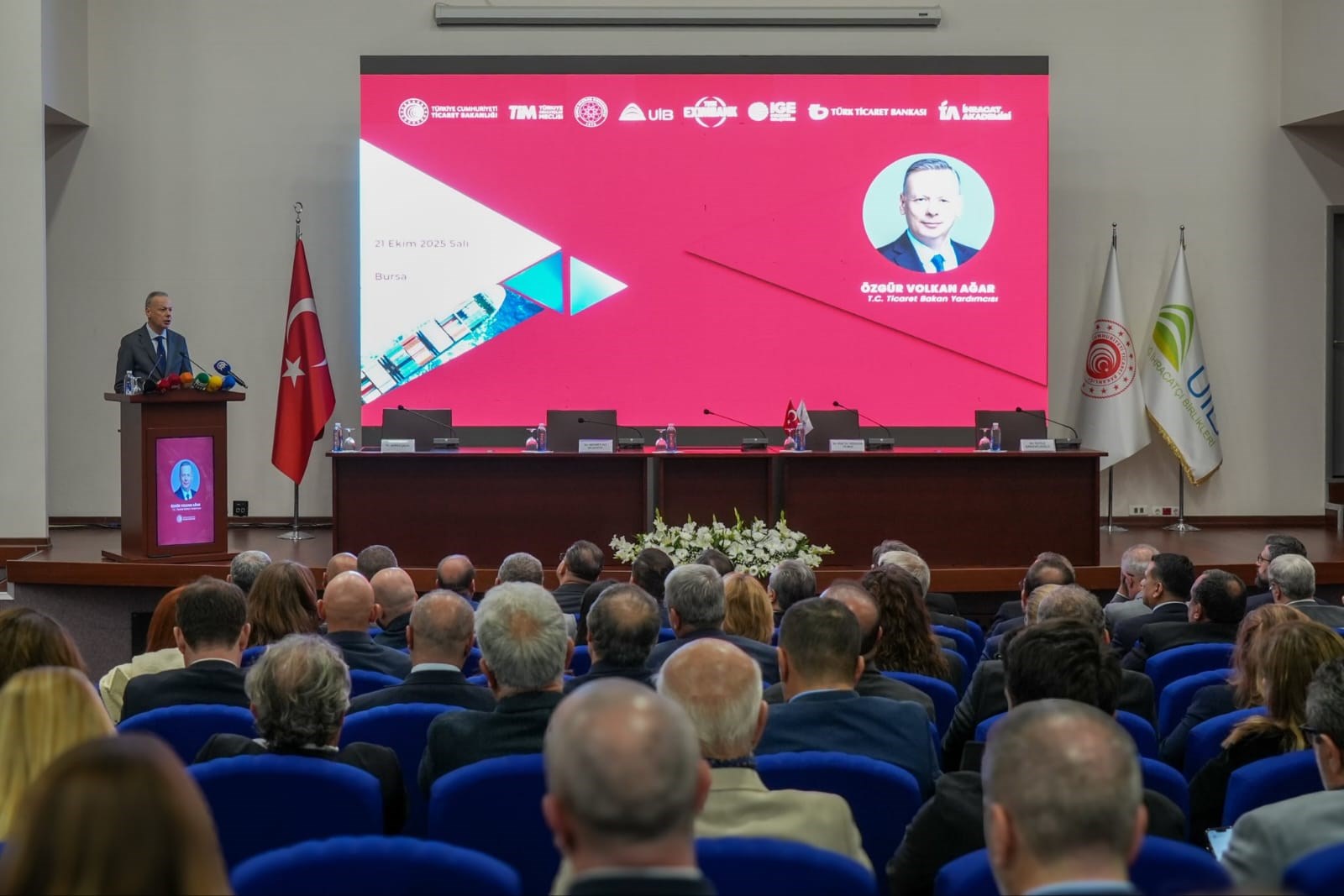 22 Ekim 2025Bakan Yardımcımız Sayın Özgür Volkan Ağar ile İhracat Genel Müdürümüz Mehmet Ali Kılıçkaya, 21 Ekim 2025 tarihinde, Uludağ İhracatçı Birlikleri (UİB) koordinasyonunda gerçekleştirilen; İhracatın Finansmanı ve Devlet Destekleri Paneli, Türk Ticaret Bankası Bursa Şubesi Açılışı, İhracat Akademisi Protokolü İmza Töreni ve İhracatın Finansmanı ile Devlet Destekleri Paneline katıldı.